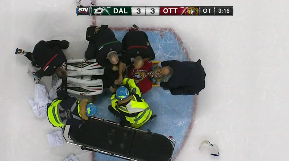 - In an effort to swing momentum back in favour of his team, Chris Neil takes things into his own hands. And by things I mean his stick and into his own hands I mean a Star's face. Neil goes off for 4 minutes, as Dean Brown explain that "visible injury" doesn't necessarily mean blood for the 50th straight broadcast. Congratulations Dean!