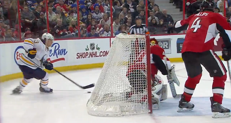 8:29 - Drew Stafford draws a penalty from Eric Gryba as he takes the puck to the net. Ottawa weathers the storm thanks to some fine goaltending from Craig Anderson. "No worries here, guys. I've got us covered," says Anderson to his penalty killers.